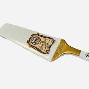The matching pie or cake server has the pig chef design on main section. At handle, there is a rich gold section and words Bon Appetit written upon it.