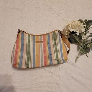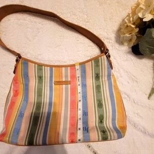 Medium size jamican Hawaiian or coastal bag. Jamaica Bay Pineapple Tropical Striped Purse, Shoulder bag, Handbag, Size Meduim. Multi-color brown/red/green/Beige, canvas rainbow colors with faux leather Strap. Plenty Compartmets for storage. One outside Zipper pocket on the back. Zipper opening for two main compartments, Jamaica logo on one side and two open pockets on the other side.