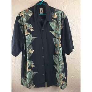 Jamaica Jaxx Black Silk Flowers Hawaiian Leaves Summer Beach Large Shirt Large