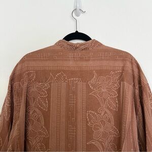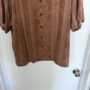 Brown, 100% silk, short sleeve aloha style shirt. Has button front closure.