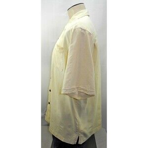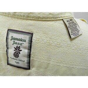 Jamaica Jaxx Authentic Island Style men's size Extra Large silk short sleeve shirt is in excellent condition. Great summer shirt! Pale yellow silk with gold accent stitching and a subtle woven pattern adding texture. Seven-button Front with left chest pocket with accent stitching. Short sleeves with cuffs, side pleats in back, straight hem with side vents. Two extra buttons. 100% Silk, Machine Wash.