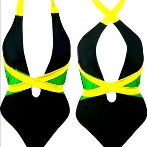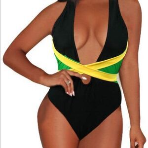 One piece monokini swimsuit featuring the colors of Jamaica; 2 ways to wear this piece.