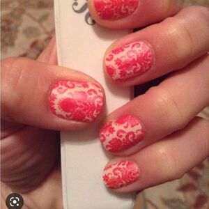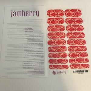 Jamberry Tapestry Full Sheet Nail Wraps 1K76. Glossy nail wraps with a dark cream or light tan background and allover red tapestry print.