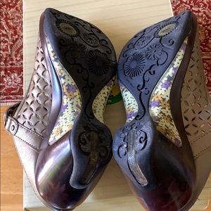 Gold wedges/clogs. Very comfy. Velcro adjustable strap. Can be worn year round with socks or not. Box included.