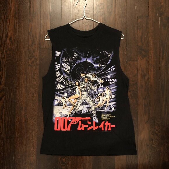 James Bond 007 Moonraker graphic cut-off tank top men's size small. Black shirt with full color graphic print. 60% cotton, 40% polyester.