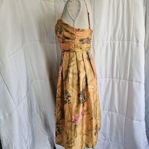 James Coviello x Anthropologie yellow/gold floral dress with folded top and a-line skirt, adjustable straps and back zipper.