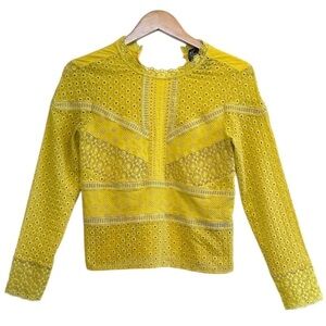 James Coviello Burnham, Lace, Yellow, Long Sleeve, Eyelet, High Neck, Top, XS