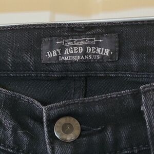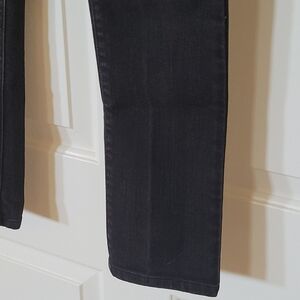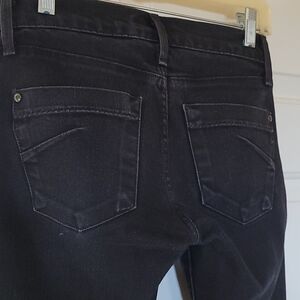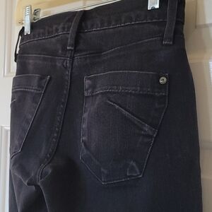 Fantastic pair of black ankle length jeans. Deliberate fading and flattering dart details on the pockets. These may not look like anything very exciting but don't let that fool ya--they are one of the most flattering pairs of jeans I've ever worn. 13" waist, 26" inseam approx 7" rise. Size 25 pretty true to size, might be on the small size, not a lot of stretch. Would fit 24/25 best