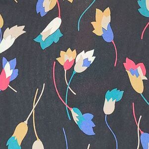 Solid black background with multi-colored flowers (blue, red, tan, green, white). Traditional button down with straight hem at the bottom. Gathering near the shoulders in the front, no darts. Traditional sleeve with 1 button cuffs. Silky feel with all black buttons. No fabric care instructions.