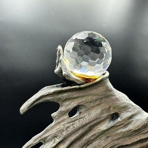 "The Wizard of Light materializes larger than life in order to destroy the Dark Castle. In his hand is a crystal sphere, which he uses to blast away all that is dark. This detailed Limited Edition sculpture by James Lane Casey is mounted on a polished wooden base, stands approximately 9 inches tall, and features high quality Swarovski crystals."