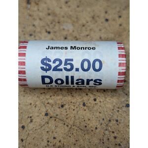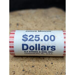 Unopened roll of James Monroe Presidential $1 coins, part of the U.S. Mint’s Presidential $1 Coin Program. The roll contains 25 coins, each featuring Monroe’s portrait and term (1817–1825) on the obverse, with the Statue of Liberty on the reverse. Paper wrapper is marked “James Monroe – $25.00 – N.F. String & Son, Inc.”, indicating bank-issued or mint-distributed origin.