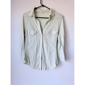The James Perse Sheer Slub Side Panel Shirt in size 8 is a stylish and sophisticated top for women. This pale green button-up shirt features a sheer panel on one side, adding a touch of femininity and elegance to the overall design. Made from high-quality materials, this shirt is perfect for a variety of occasions, from casual outings to more formal events. The regular size 8 fits comfortably, making it a versatile addition to any wardrobe.