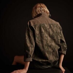 James Perse Mixed Media Olive Army Green & Tan Camo Print Front Zip Band Neck Long Sleeve Cinch Bottom Utility Jacket