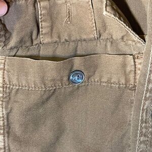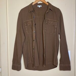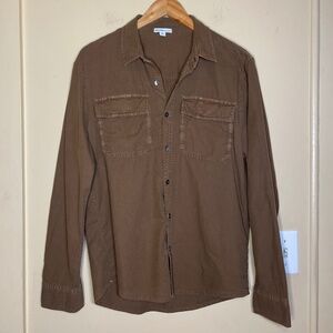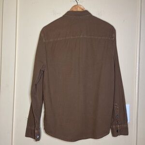 Stylish brown button-up shirt. Features two chest pockets. Long sleeves with button cuffs.
