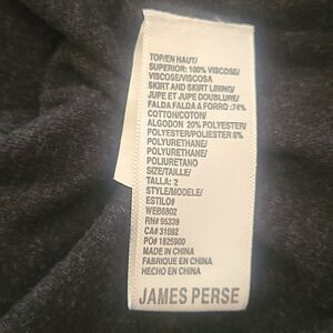 Gorgeous mini dress by James Perse. “Collage Wrap” style in two tone mixed media ft lightweight black woven bodice & charcoal grey jersey knit skirt. Bodice is a surplice crossover style with deep v neck and blousey fit. Skirt is a bodycon fit with ruching at side seams.