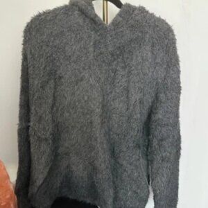 Cozy and stylish fuzzy sweater. Features a comfortable hood. Perfect for layering.