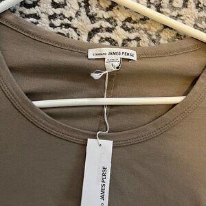 New with tags James Perse Clay colored midi dress. Fitted with rouch stitching on the sides. Long sleeve, slit detail in back, center at hemline