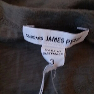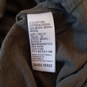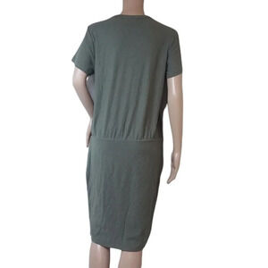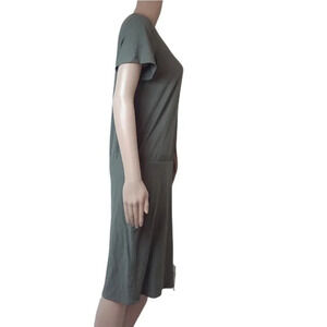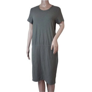 Standard James Perse ‘t-shirt’ mini dress. Olive green stretch jersey. Bound crew neckline in self fabric. Short sleeves with bound hems. Draped, blouson ‘t-shirt’. Fitted skirt. 51% cotton. 49% modal. Size 3 = large