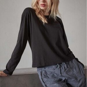 This style has a binded crew neckline and clean finished hems. The fit is boxy with a slightly cropped length. Garment dyed.