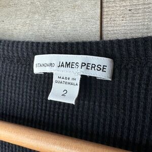 This James Perse waffle knit thermal tee features raglan sleeves, a wide crewneck, straight hemline with unseamed edges and a slightly oversized, straight silhouette. Please note there is one small hole on the right side sleeve (see photo).