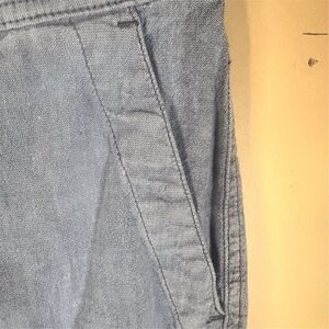 James Perse Women's Linen Cargo Pants Size 25 Blue Casual Mid-Rise Gorpcore. These James Perse women's cargo pants in size 25 feature a regular fit and a mid-rise waist. Made from a blend of 64% cotton, 35% linen, and 1% elastane, they offer comfort and slight stretch. The pants come in blue and include two front and two back pockets, belt loops, and a button closure.