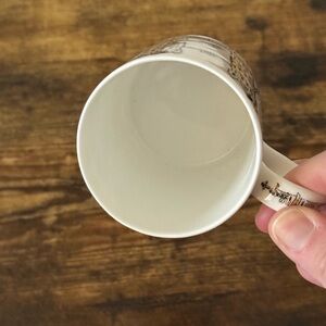 A charming ceramic mug by James Sadler, showcasing hand-drawn style illustrations of iconic London landmarks, including Big Ben, Tower Bridge, and The Tower of London. The whimsical design is accented with pops of color and handwritten labels identifying each landmark.