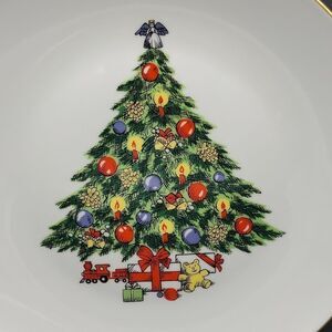 This is a Jamestown China Christmas plate. It has a Christmas tree with ornaments, presents under the tree, and a teddy bear. The plate is trimmed in gold.