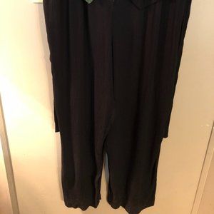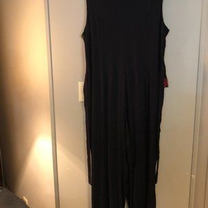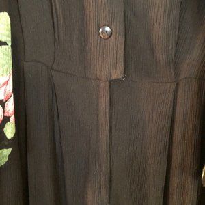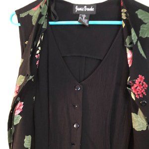 Jamie Brooke size 16 jumpsuit with black base and floral over vest. Sleeveless, V-neck, Button, hook and zipper closure of base and button closure on vest. Tie in the back. Loose pajama type leg pants. 100% Rayon. Dry clean.