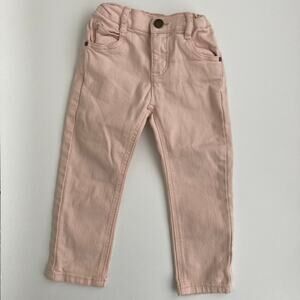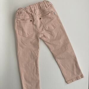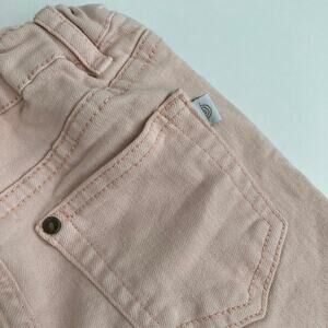 Colored denim jeans with zipper fly, snap closure and adjustable waist. Two pockets front and back. Color is a washed / vintage look peach pink. I think it may officially be Petal.