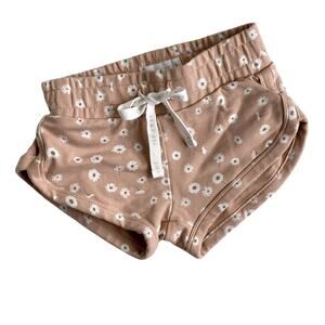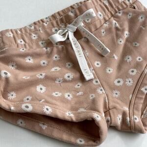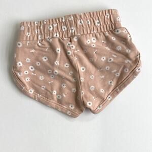 Pink - peach shorts with all over daisy floral print. Elastic waist.