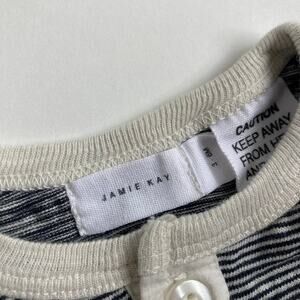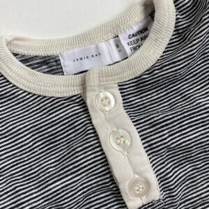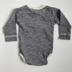 Long sleeved henley onesie with navy blue and cream micro stripes. Cream colored trim.