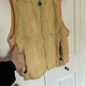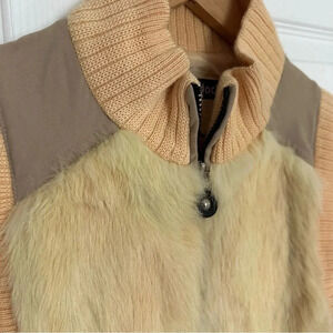 Genuine Rabbit fur on front, zippered, both front pockets are zippered with decorative pulls, back shell is acrylic and wool blend knit, shoulders made of nylon in a khaki color, Excellent used condition
