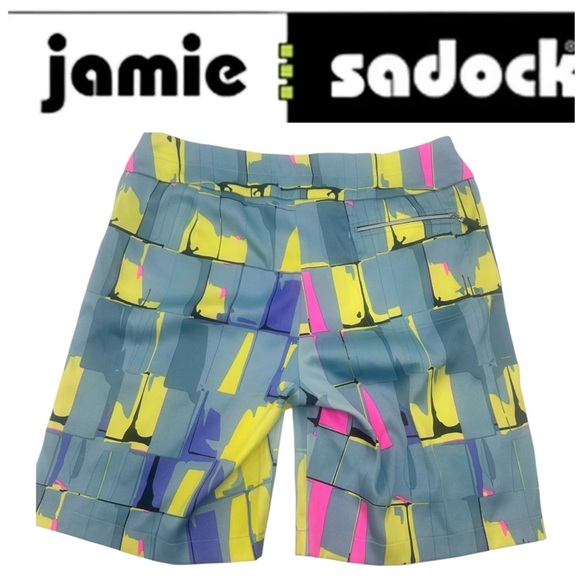 Description : Jamie Sadock Golf Shorts, Primarily light blue multi-colored abstract print design with two front and two back zip pockets along with a fun front leg tee pocket.
