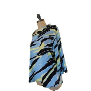 Jamie Sadock Size L Large golf tennis shirt with 3/4 sleeves. This slinky, stretchy collared shirt offers a comfortable fit perfect for an active lifestyle. Off set collared neckline, slinky stretchy artsy print fabric, 3/4 sleeves- unique and super cute top