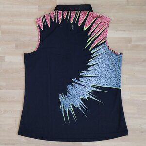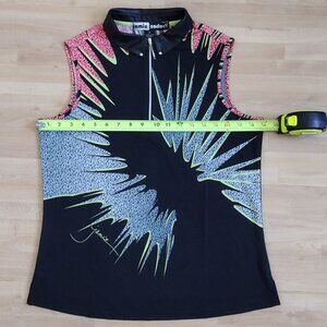 Ladies Jamie Sadock Sleeveless Graphic Top: Beautifully soft, smooth, wrinkle-free breathable fabric and a comfortable fit. Vibrant pattern is printed on the front and back (please see photos). Has stand-up, leather collar.