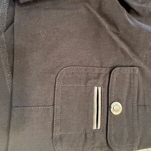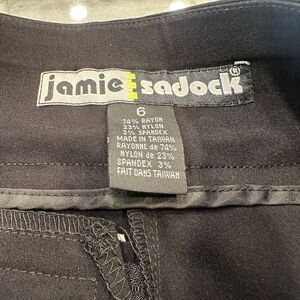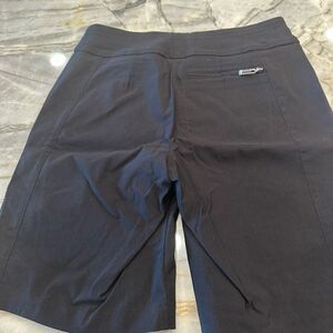Jamie Sadock size 6 black golf shorts with silver hardware on the zip up front pockets and a snap detail on the lower left leg pocket. Back pocket also has a zipper. Made of 24% rayon 23% nylon and 3% spandex. Super comfortable and flattering.
