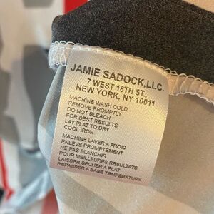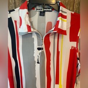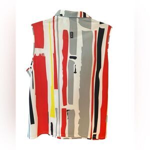 Discover the vibrant charm of this sleeveless blouse by Jamie Sadock, featuring a relaxed fit and a striking graphic design. The red and blue hues, combined with a polo collar, make it a standout piece for any casual occasion.