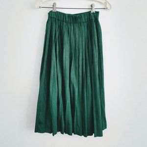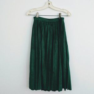 Luxe micro (faux) suede midi skirt in a deep emerald green. Zipper closure with elastic at back of waistband. Gentle pleats add a beautiful movement. So soft and the perfect jewel-tone for fall and the holidays. Great for work, casual wear, holiday parties and even Christmas photos. Korean brand. Marked size F, which means one size fits most. Please use measurements below to ensure fit.