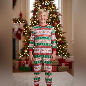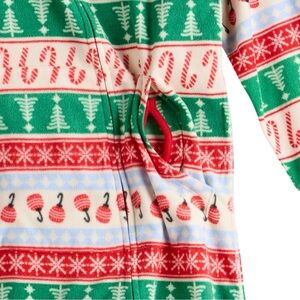 Cozy onesie pajamas with a festive holiday pattern. Features red, green, and white colors.