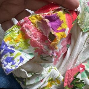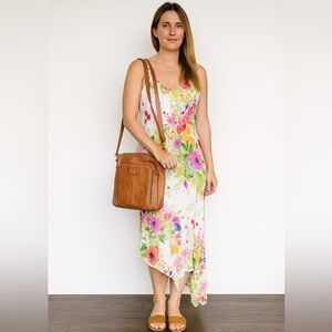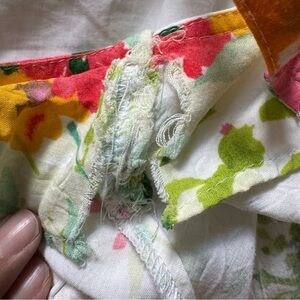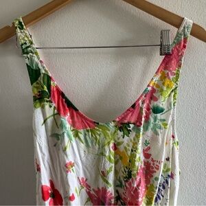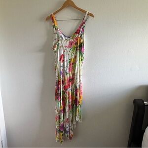 Colorful dress with floral patterns. Features red, pink, and green on a white background. Perfect for a vibrant look.