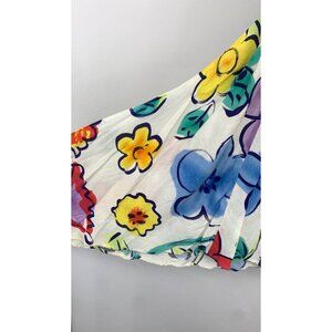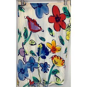 This is a vintage women’s skirt by Jams World. This skirt has a white base and multicolored floral pattern. This skirt features an elastic waistband and a front slit. This skirt is in excellent pre-owned condition.