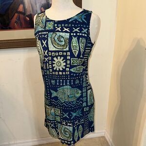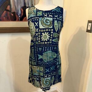 So cute! Stylish sleeveless dress with a vibrant blue and teal pattern. Perfect for casual outings. It is made of lightweight cotton and so comfortable. Perfect condition!
