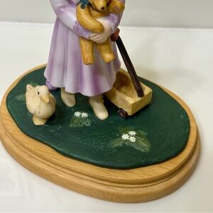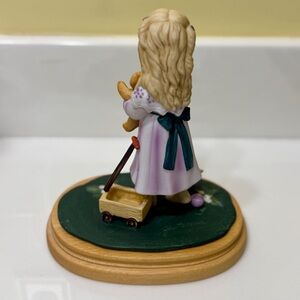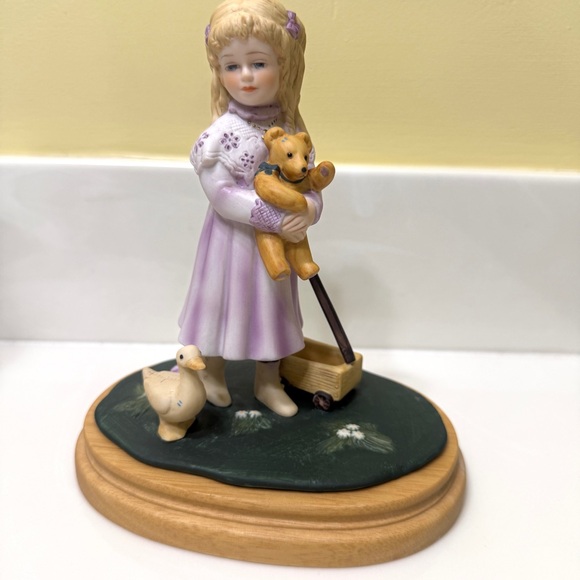 Featuring a young girl in a Victorian-style lavender dress holding a teddy bear, standing next to a small duck and a pull-cart.