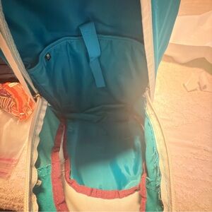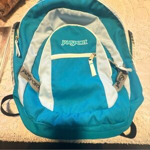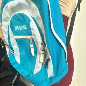 Stylish JanSport backpack in blue and white. Perfect for school or travel.