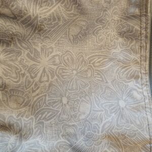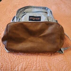 JanSport Large Leather Bottomed Light Blue Floral Backpack. Needs a good cleaning/wipe down. Has a few flaws: two small wear spots on bottom leather corner, ink smear on top strap, small tear on side pocket netting. But good shape aside from those flaws.