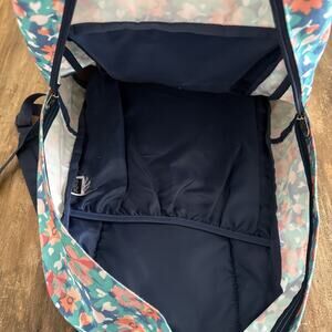 AUTHENTIC JANSPORT RIGHT PACK EXPRESSIONS ORIGINALS BACKPACK. LIGHT BLUE WITH PINK FLORAL PRINT. POLYESTER BODY WITH BROWN SUEDE LEATHER BOTTOM. PADDED SHOULDER STRAPS. LAPTOP COMPARTMENT FRONT ZIPPER POCKET AND LARGE MAIN COMPARTMENT. MADE IN VIETNAM. APPROX SIZE 17 X 13 X 8 INCHES (43 X 33 X 20 CM). EXCELLENT PREOWNED CONDITION. SEE PHOTOS FOR DETAILS.