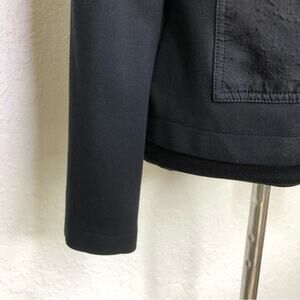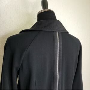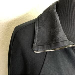 Jana Kos black full back and front zip jacket. Fold over collar with full zip front. Double side pockets. Full zip back. Mixed material on collar and pockets. Size Small. Excellent preowned condition. Minor wash wear. Rayon nylon spandex blend.