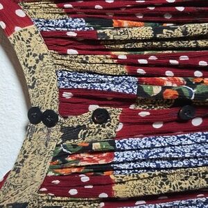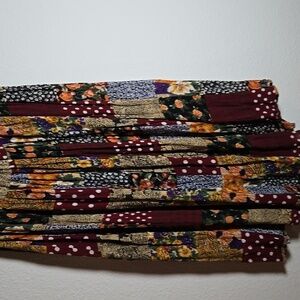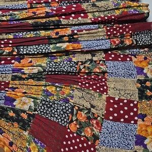 This vibrant floral patchwork skirt is perfect for adding a pop of color to your wardrobe. Featuring a mix of red, black, and cream tones, it's both stylish and versatile.