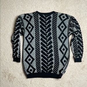 This cozy crew neck sweater features a bold geometric pattern in black and gray, perfect for adding a touch of style to your wardrobe. Its thick, chunky knit texture ensures warmth, while the relaxed fit and ribbed cuffs offer comfort and a classic look.