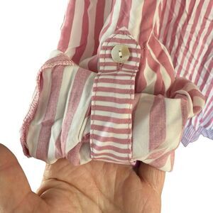 This Jane + Delancey tunic blouse is a must-have for any casual wardrobe. The blouse features a V-neckline, pullover closure, and long roll-tab sleeves. The blouse is made of lightweight rayon material with a striped pink and white pattern, making it perfect for summer, fall, or spring occasions.
